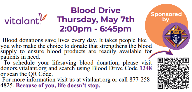 Knights of Columbus sponsored Blood Drive Thursday, May 7, 2026 2:00 PM 6:45 PM 14:00 18:45 Google Calendar ICS