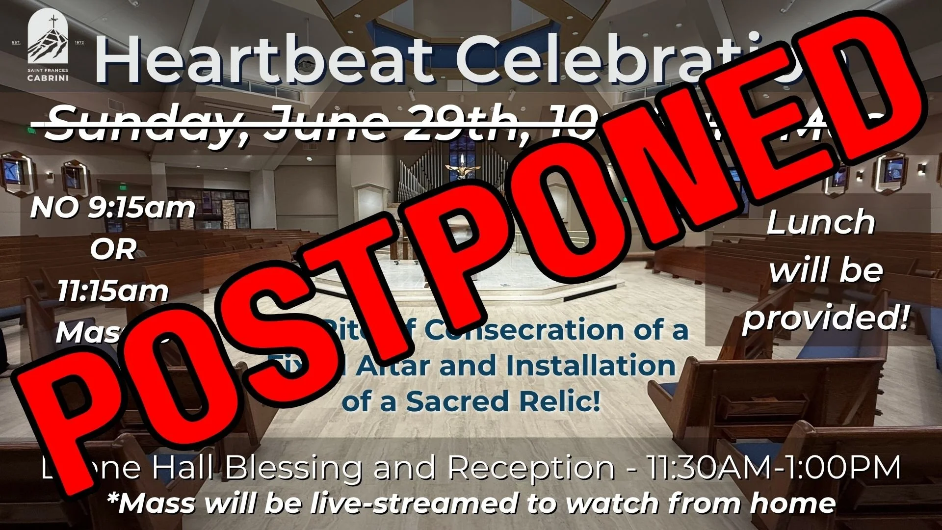 Due to delays in shipping of the marble that will be used to complete the new altar, we are disappointed to announce that we must POSTPONE the Rite of Consecration of a Fixed Altar and Installation of a Sacred Relic.