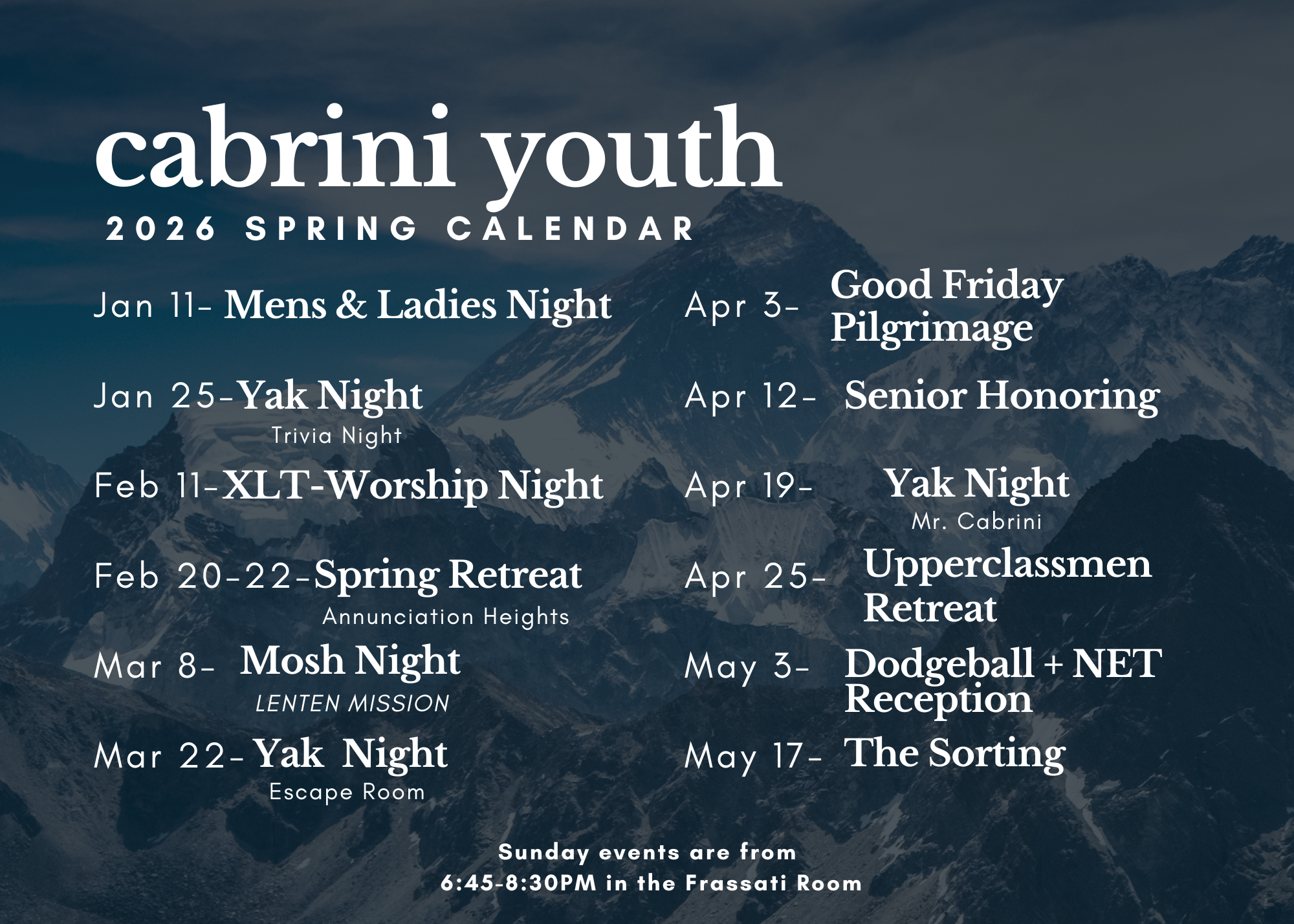 Yak and Mosh Nights are our high school community nights that follow 5:15PM Mass on Sundays during the academic year. “Yak” and “Mosh” nights look different but are correlated, and the names are purely just fun to say...there is no meaning behind them.